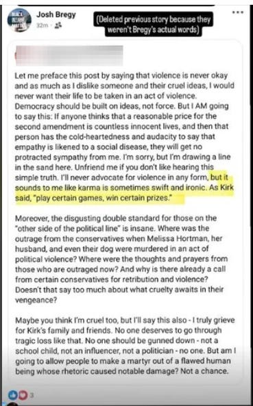 Even though Bregy’s Facebook account only allowed confirmed friends to view posts, the post, along with posts that appeared to mock or celebrate Kirk’s death from two other Clemson staff members, was flagged by the Clemson College Republicans. It eventually led to social media backlash from Republican elected officials who called for the ousting of the three employees. Clemson also received a letter from the legislative budget chairmen, the House speaker and Senate president calling on the school to take immediate and appropriate action.