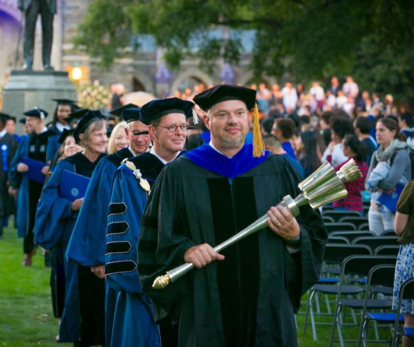 Protest is a quintessential American idea, born of a violent Revolution against a Monarch. Once we had a Constitution, then we had ways to “fight” in non-violent ways. The impulse to protest concentrated power feels righteous, and remains, but the prohibition against physical violence is absolute on a college campus. Part of my angst may simply be that since I am a tenured full professor who has had all sorts of leadership posts at the University, I am in many important ways, “the man.” Maybe this is just hard for me to accept. I do not like thinking of myself as “the man” but there I am leading the procession for the inauguration of President Vince Price, in October, 2017.