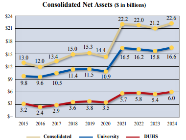 Duke had net assets of $22.6 Billion at the end of fiscal year 2024, according to Duke Public Financial Statement 2023-24 (see figure below, from p. 4: Net assets of the University, including the School of Medicine, were $16.6B; Net assets for Duke University Health System (DUHS), were $6.0B). DUHS is a North Carolina based non-profit corporation that is a “wholly controlled affiliate of Duke University” (see note 1, p. 20). DUHS owns hospitals, physician practices in Durham and across North Carolina and a medical malpractice insurance corporation domiciled in Bermuda. Duke University owns the Duke Health System. When the Board of Trustees talk about Duke, they are likely referring to the University and the Health System.