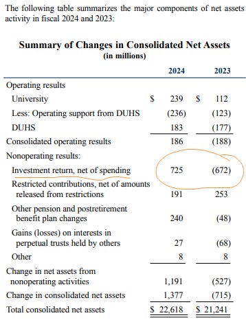 The transition from 2023 to 2024 was unusual because the Duke University Health System bought the for-profit corporation physician practice (the Private Diagnostic Clinic) that has been a provider of physician services to patients seeking care at Duke since 1931. More on this odd and crucial part of Duke’s history later. The point is that Duke’s ability to function and invest in either maintenance or new programs is highly dependent upon the investment returns that Duke’s investment company DUMAC produces year to year. Further, the performance of the Duke University Health System has an effect on the financial bottom line of Duke University.