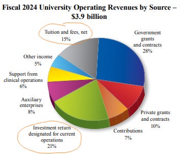 Investment returns are a larger source of Duke University revenue (21% v. 15%) than tuition (net of financial aid)